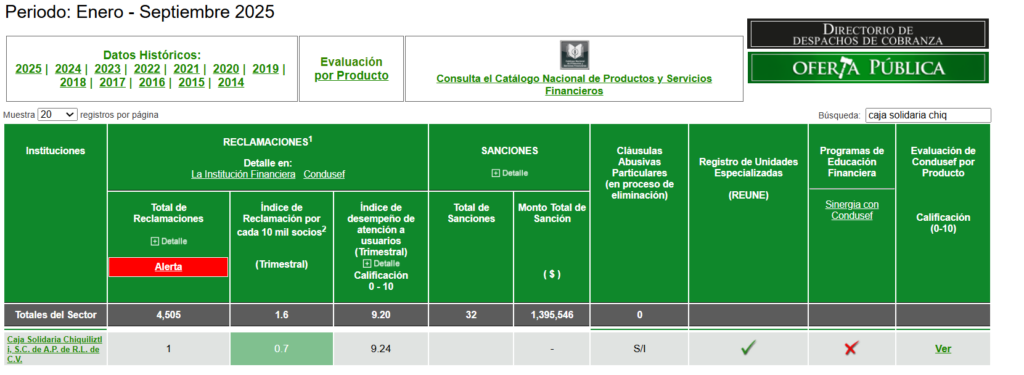 La información corresponde únicamente a la entidad financiera Caja Solidaria Chiquiliztli S.C. de A.P. de R.L. de C.V. Para conocer la información, así como la de todo el sector de las cooperativas de ahorro y préstamo, se podrá acceder al sitio: .::: Buró de Entidades Financieras :::. (buro.gob.mx)
