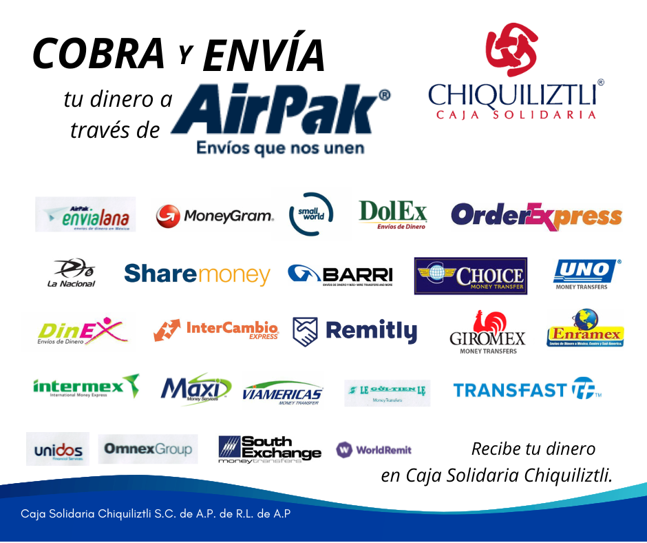 En Caja Solidaria Chiquiliztli puedes cobrar tus remesas por medio de AirPak, de manera fácil y segura.